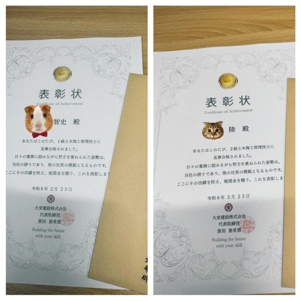 このたび当社の若手社員2名が、土木施工管理技士の資格試験に合格しました^^